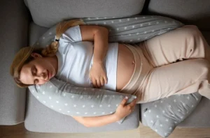 Gunakan bantal kehamilan berbentuk U atau C untuk menopang tubuh
